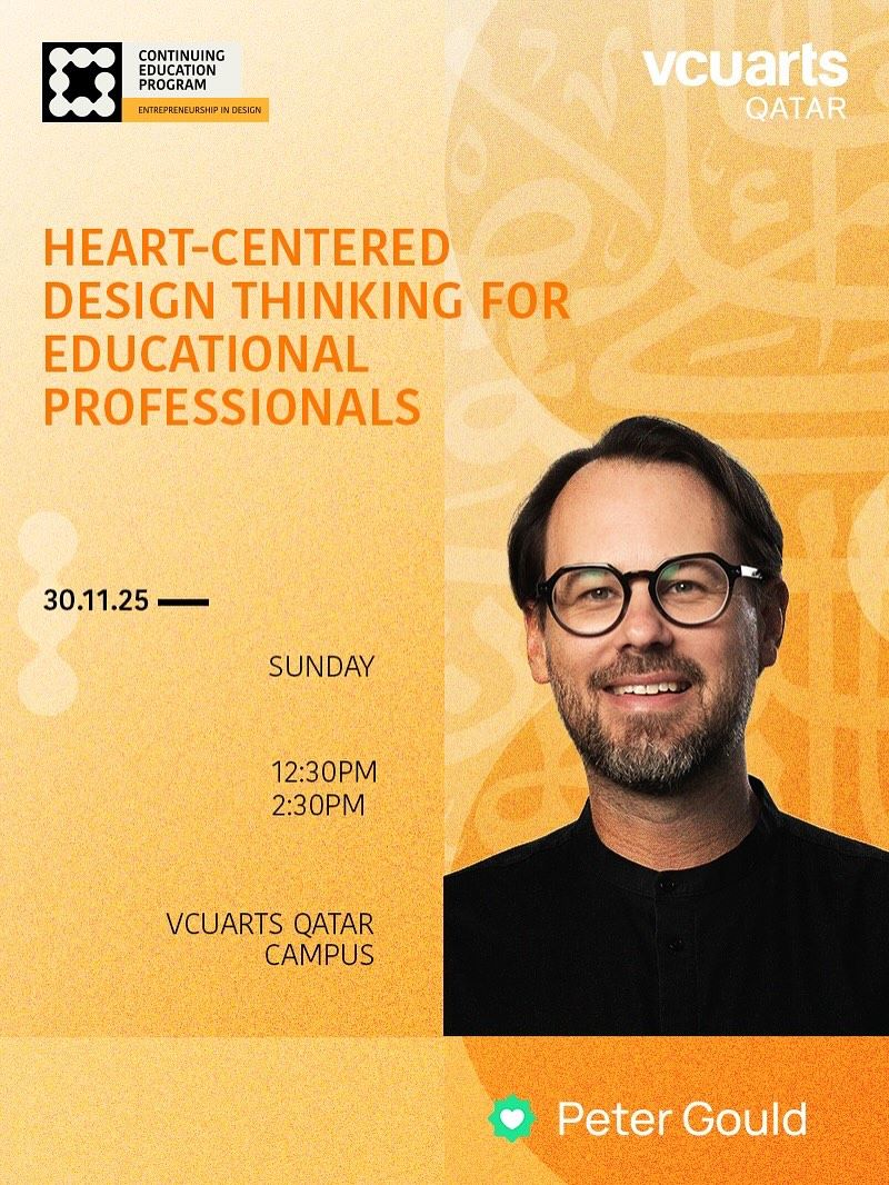 The Heart-Centered Design Thinking Series, hosted by VCUarts Qatar Continuing Education Program, offers inspiring workshops led by internationally recognized designer and educator Peter Gould. Rooted in his pioneering heart-centered design approach, these sessions invite participants to explore how creativity, strategic design, and values can be aligned to foster meaningful impact in both education and creative industries.